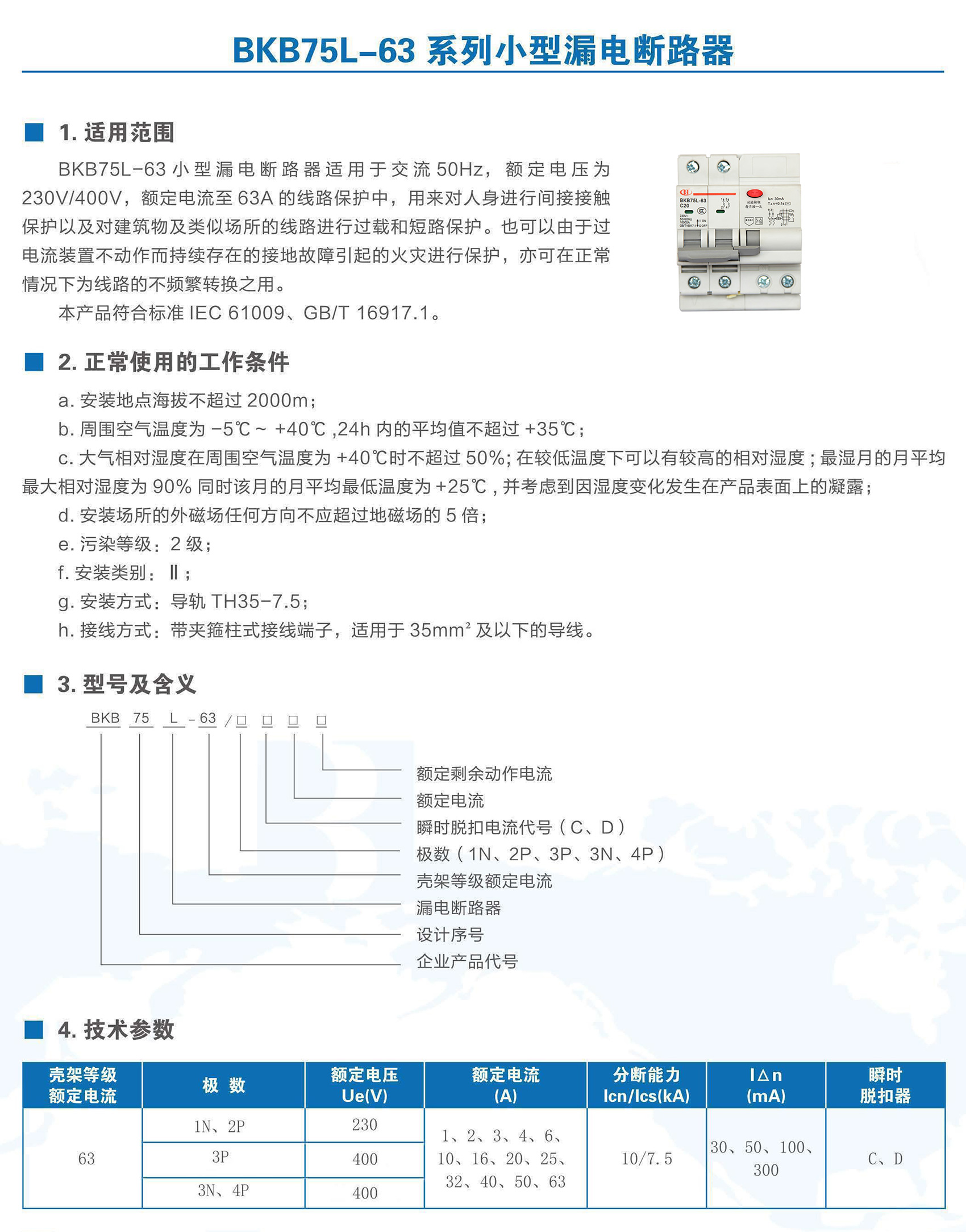 BKB75L-63系列带剩余电流保护小型断路器适用于交流50/60Hz、额定电压至400V,额定电流1~63A 的线路中。作为人身触电和设备漏电保护之用,并可用于线路和电气设备的过载以及短路保护。在正常情况下亦可用于不频繁的通断操作。本产品符合GB/T 16917.1、IEC 61009-1标准。