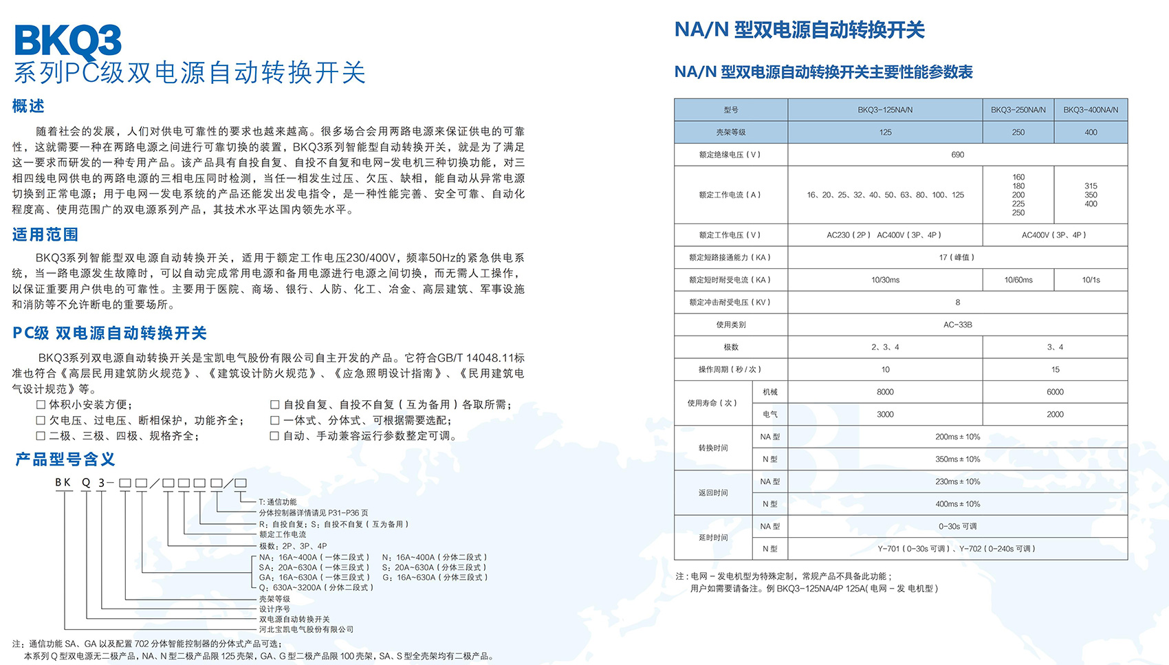 BKQ3-3200Q系列自动转换开关电器适用于交流50/60Hz,额定工作电压400V,额定电流800A至3200A的双路配电系统中,产品由开关本体与转换控制器两部分组成,本体采用电磁线圈驱动,转换速度快;转换控制器具有对两路三相电源的过电压、欠电压、缺相等故障检测功能;同时带有发电机组启、停信号输出。主要应用于医院、商场、银行、化工、高层建筑、军事设施、消防等不允许断电的重要场所。产品符合GB/T 14048.11《低压开关设备和控制设备 第 6-1 部分:多功能电器 转换开关电器》。